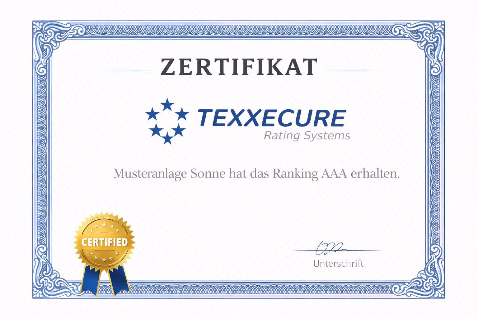 Das TEXXECURE Zertifikat zeigt zuverlässig, wie sicher und leistungsfähig eine Photovoltaikanlage ist. So entsteht eine transparente, objektive und leicht verständliche Dokumentation für Investoren, Banken, Versicherer und Betreiber.